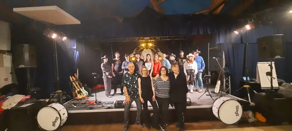 Stage formation country Line dance à Mûr de Bretagne. Guillaume Richard, Daren Bailey, Guylaine Bourdages, Kate Sala et l orchestre des Rusty Legs.